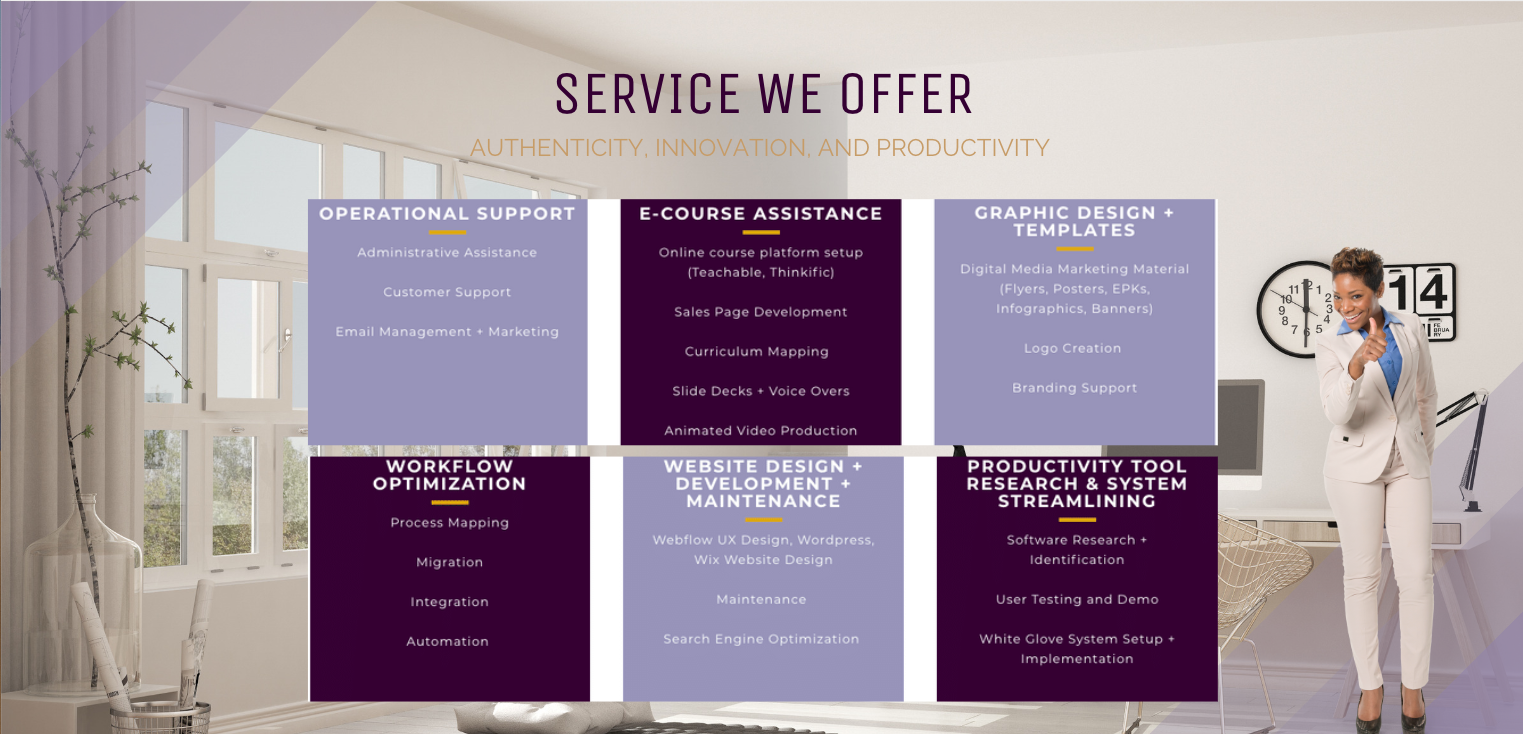 "We work with entrepreneurs virtually to provide support, guidance, and services to boost their operations. The goal is to help you grow your business structure and increase your organization, so you can do better business with less distraction, disruption and doubt.