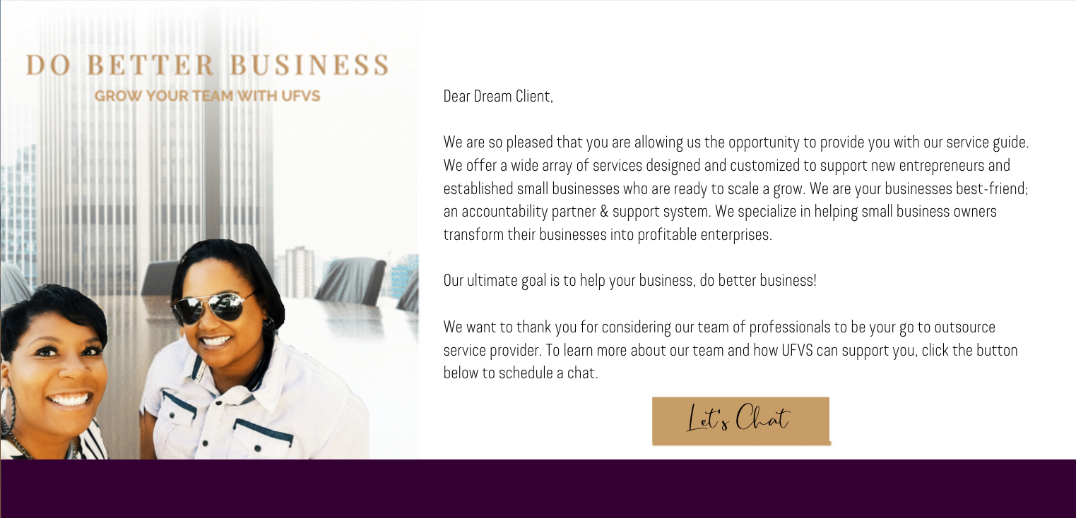 We want to thank you for considering our team of professionals to be your go to outsource service provider. To learn more about our team and how UFVS can support you, click the button below to schedule a chat.
