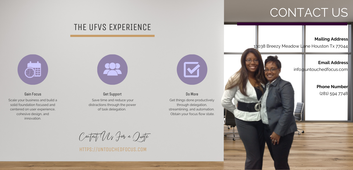 Untouched Focus Virtual Solutions is committed to inspiring, empowering, and supporting the growth of small businesses for women and minorities to form positive local and social change. Focusing on what matters: Authenticity, Innovation and Productivity so our businesses can achieve more.
